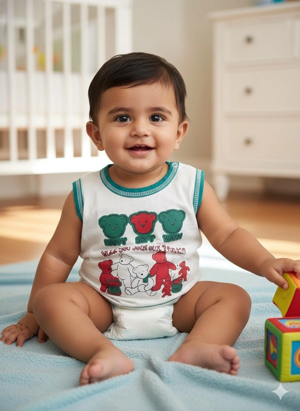 A charming and functional piece of infant wear, this top features a sweet teddy bear motif. The inclusion of a shoulder snap button makes it practical for parents, while the soft colors and whimsical "Bear Party" theme make it a cute choice for daily wear.