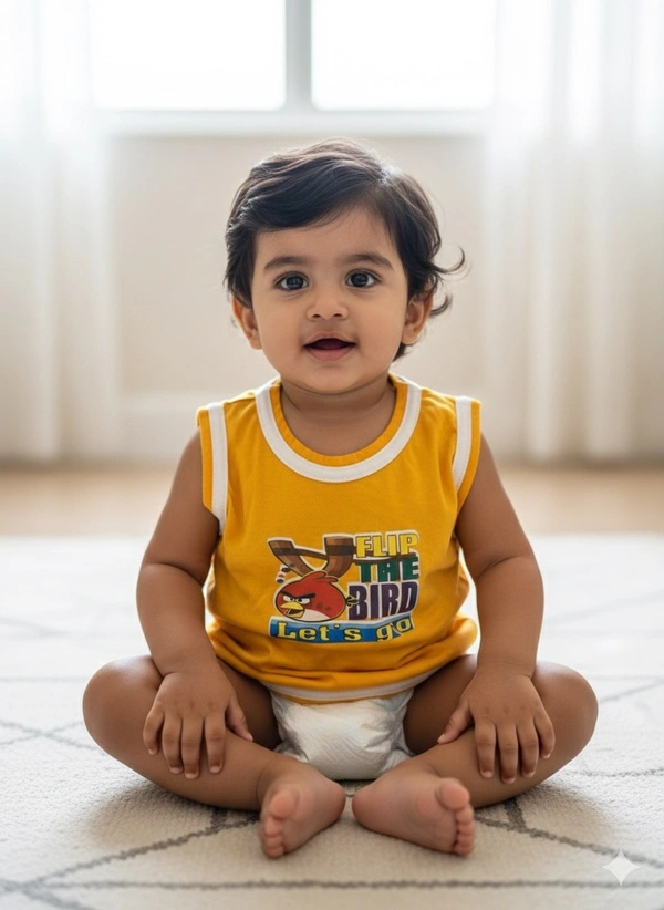 mustard-yellow, sleeveless children's top featuring a graphic design