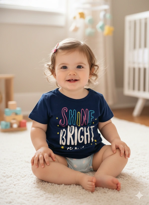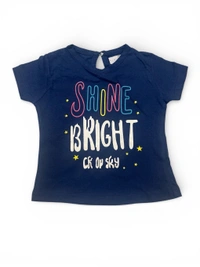An inspiring and comfortable navy blue infant t-shirt from Kidly Boo featuring a multi-color "SHINE BRIGHT" graphic. Accented with playful yellow stars and unique typography, this soft cotton-blend tee includes a practical back keyhole closure for easy dressing.