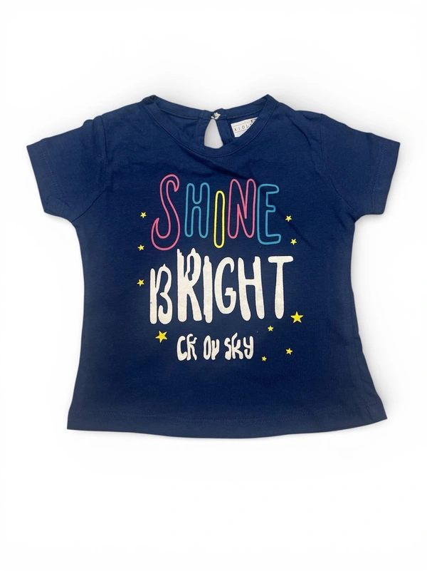 An inspiring and comfortable navy blue infant t-shirt from Kidly Boo featuring a multi-color "SHINE BRIGHT" graphic. Accented with playful yellow stars and unique typography, this soft cotton-blend tee includes a practical back keyhole closure for easy dressing.