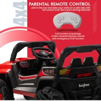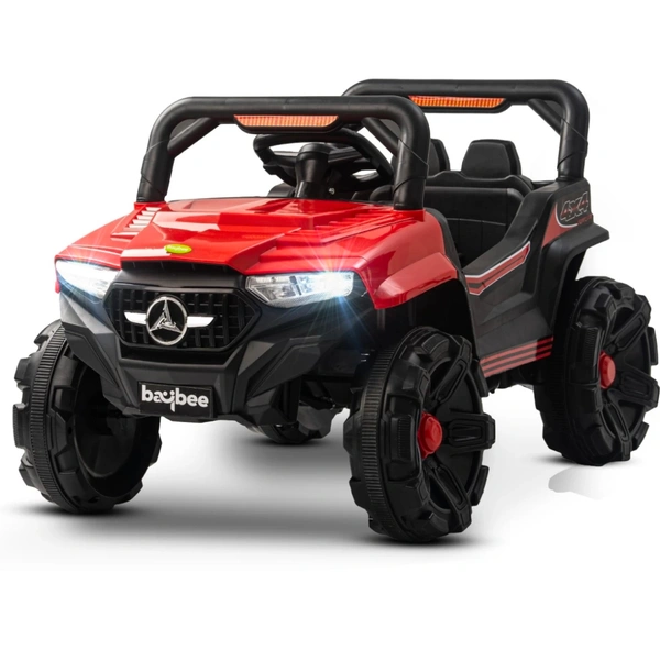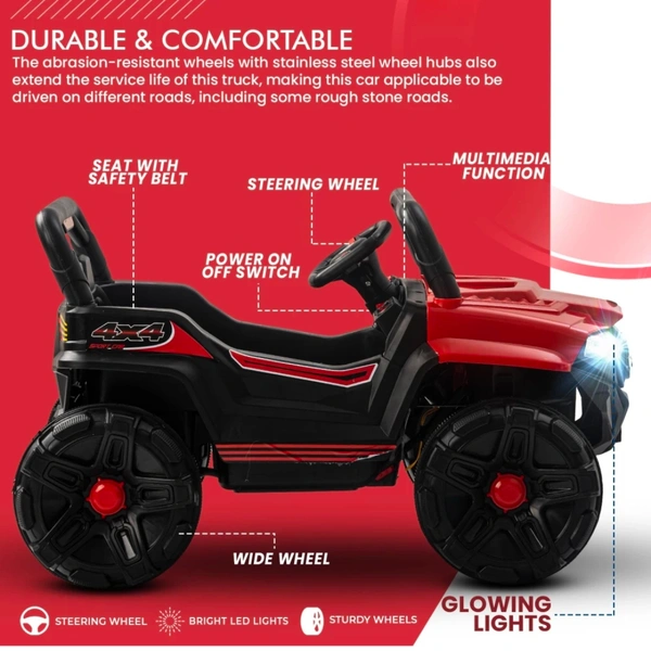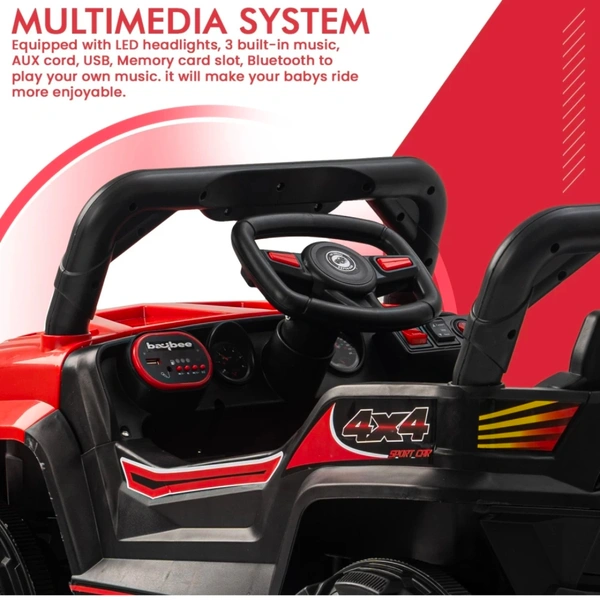 [Dual Mode Ride on Jeep] - The Ride on car can be controlled by dual control modes. Parent can help your children control this jeep with 2.4G wireless remote controller or baby can operate this car by himself/herself by step on the accelerator, turn the steering wheel and shift the forward/backward moving mode, your kids will practice hand-eye-foot coordination, enhance courage, and build confidence through this wonderful vehicle [Realistic Design] Electric Car gives your kids realistic driving experience just like a real vehicle with a horn, led Headlights, inbuilt music, Bluetooth, USB, Aux & remote controller, You can connect it to Bluetooth, USB port or Aux and play a wider selection of songs and stories. The buttons near the USB port are for decorative purposes The charging hole is hidden to prevent water entering it and to enhance the toy’s aesthetics [Durable & Comfortable]– This electric ride on car features two wear-resistant seats that can feel comfortably for your kids. The four wear resistant wheels equipped with suspension spring inside to provide your kids with smooth driving feeling [Safe to Drive] - Powerful engine with a slow start for safer use. The bright LED lights on the front of this car allow for safe night-time driving. The steering wheel can only slightly change the direction of the car, which helps prevent accidental overturning [Fun for Hours] - When this ride on car is fully charged, your baby can continuously play it for 40 minutes which makes sure that your baby can abundantly enjoy it. NOTE:- PRODUCT REQUIRES EASY SELF-ASSEMBLING. INSTRUCTION MANUAL PROVIDED WITH THE PACKAGE