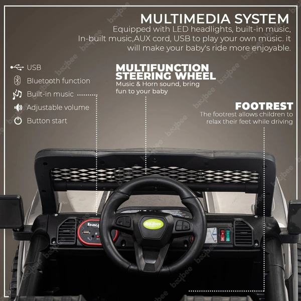 Battery Car gives your kids realistic driving experience just like a real vehicle with a horn, led Headlights, inbuilt music, Bluetooth, USB, Aux & remote controller, You can connect it to Bluetooth, USB port, or Aux and play a wider selection of songs and stories. The buttons near the USB port are for decorative purposes The charging hole is hidden to prevent water from entering it and to enhance the toy’s aesthetics