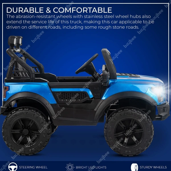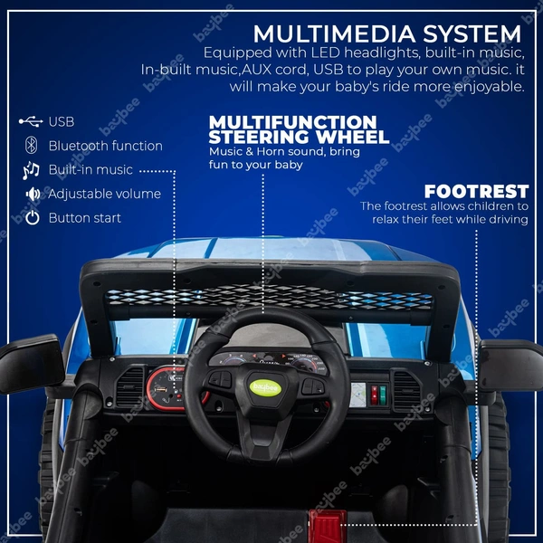 Battery Car gives your kids realistic driving experience just like a real vehicle with a horn, led Headlights, inbuilt music, Bluetooth, USB, Aux & remote controller, You can connect it to Bluetooth, USB port, or Aux and play a wider selection of songs and stories. The buttons near the USB port are for decorative purposes The charging hole is hidden to prevent water from entering it and to enhance the toy’s aesthetics